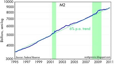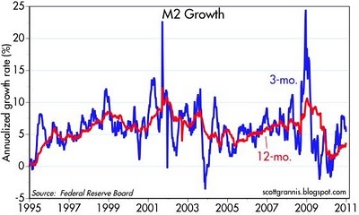 I've been a fan of the M2 measure of money for a very long time. It's been the most stable definition of money, and it's had the best correlation to the economy of any other measure. As these charts show, the behavior of M2 over the past 15 years hasn't changed much at all. There have been periods of faster growth (2001-2003, 2008-2009), but they have been followed by slower growth, with the result that M2 has grown on average about 6% a year. That's a little faster than the 4.7% annualized growth rate of nominal GDP over the same period, but not by much. Importantly, there is nothing here to suggest that M2 is growing faster or slower than it has for a long time; no sign of any inflationary impact from QE2, and no sign of anything that might be deflationary.