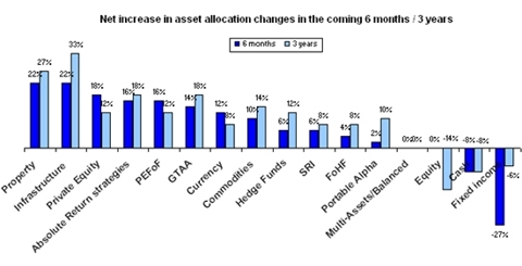 So is the case with alternatives, according to bfinance’s winter 2010 survey released late last month (click here to view the survey), which notes that property, infrastructure, private equity and “absolute return strategies” are not only back in favor but all the rage among pension funds. (Click chart to enlarge.)