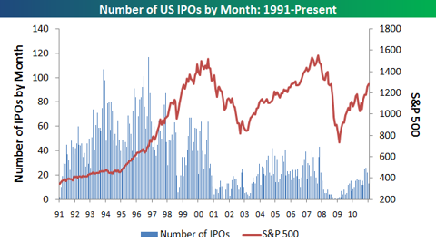 Hickey and Walters (Bespoke) submit: Below is a chart showing the number of US initial public offerings (IPOs) by month going back to 1991. After becoming non-existent during the 2008 collapse, IPOs have been making a comeback. Since the current bull market began in March 2009, the number of IPOs by month has steadily increased. While we're still not getting the amount of IPOs seen during the mid-2000s bull market (and not nearly the amount seen during the Internet bubble), at least things are moving in the right direction (click to enlarge).