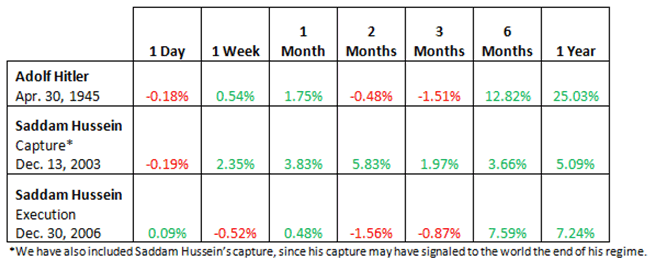 With Osama Bin Laden?s death announcement Sunday, we take a look at how the market performed following the deaths of two other infamous leaders guilty of crimes against humanity ? Adolf Hitler and Saddam Hussein.